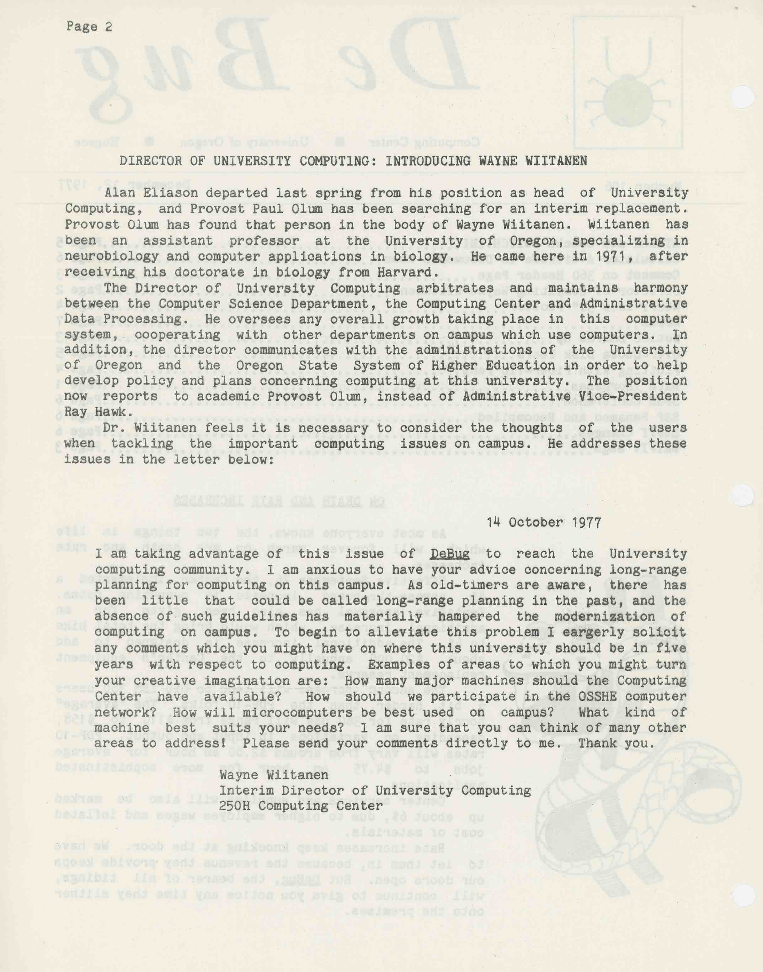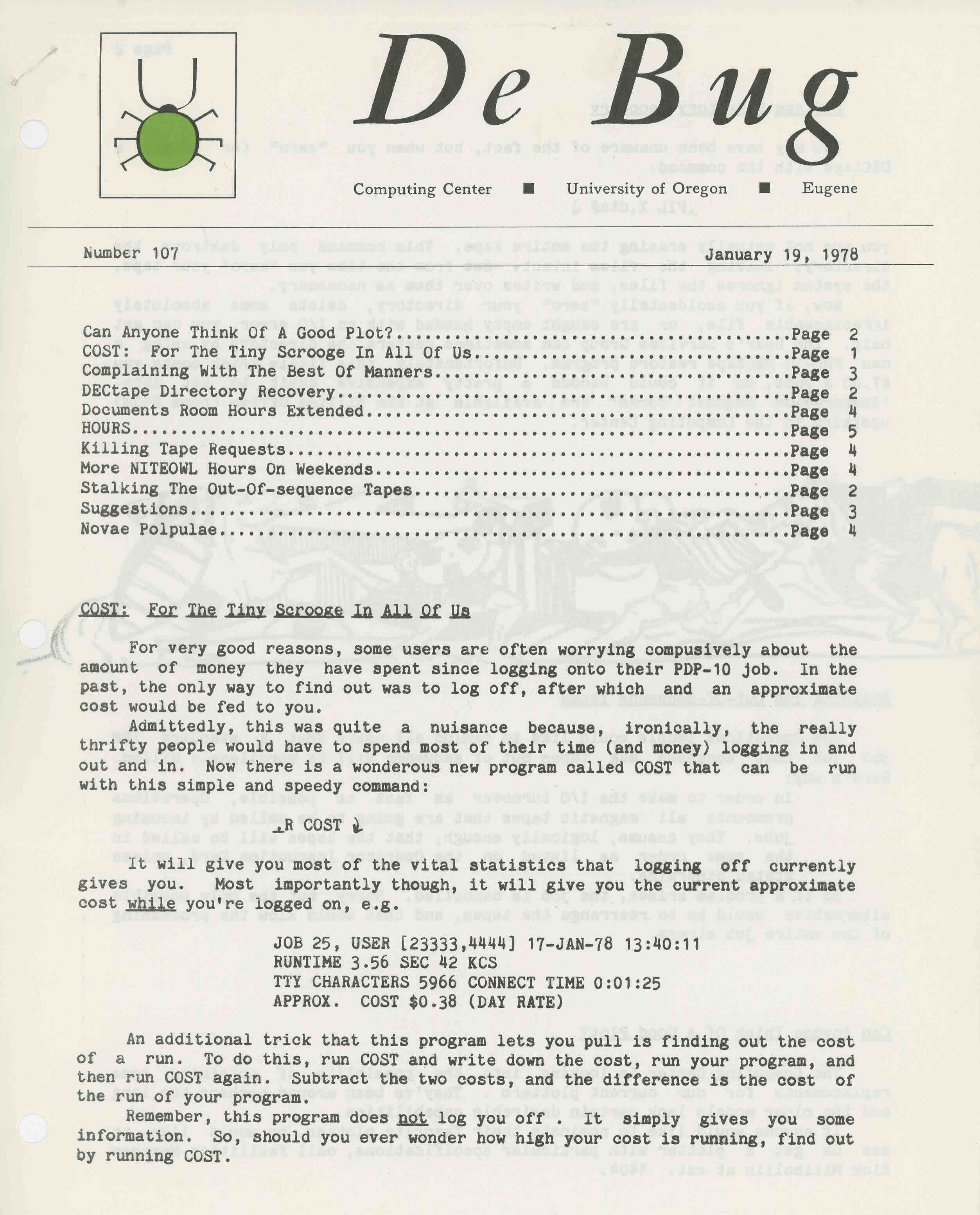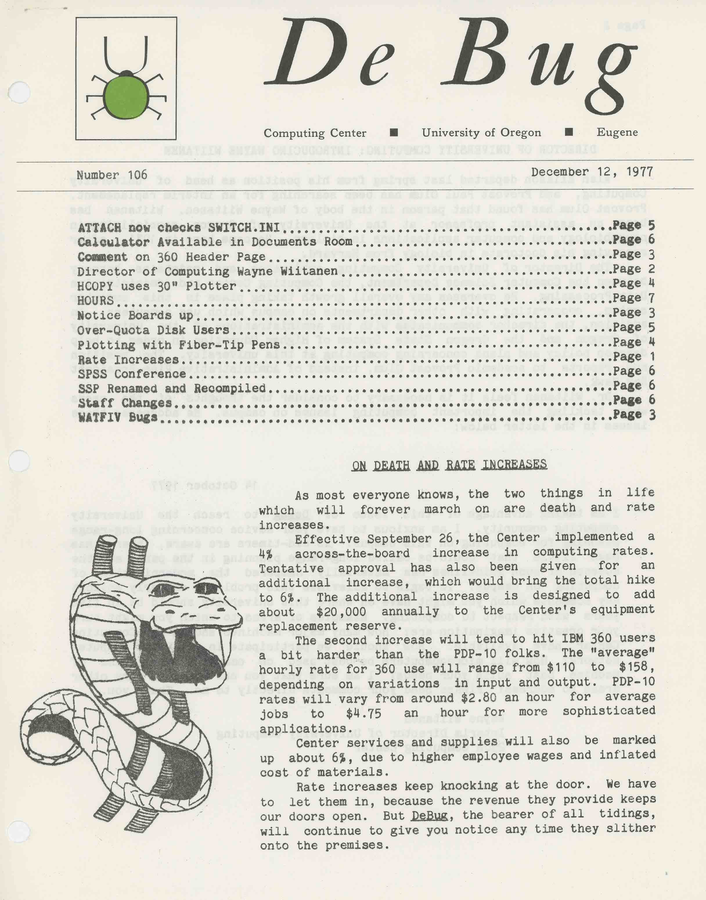 Greg BryantIn 1977 I began to write and produce a publication that I'd been reading with purpose and pleasure since 1974. De Bug or DeBug was the University of Oregon's computing journal, from the heart of the campus technology community, the Computing Center.