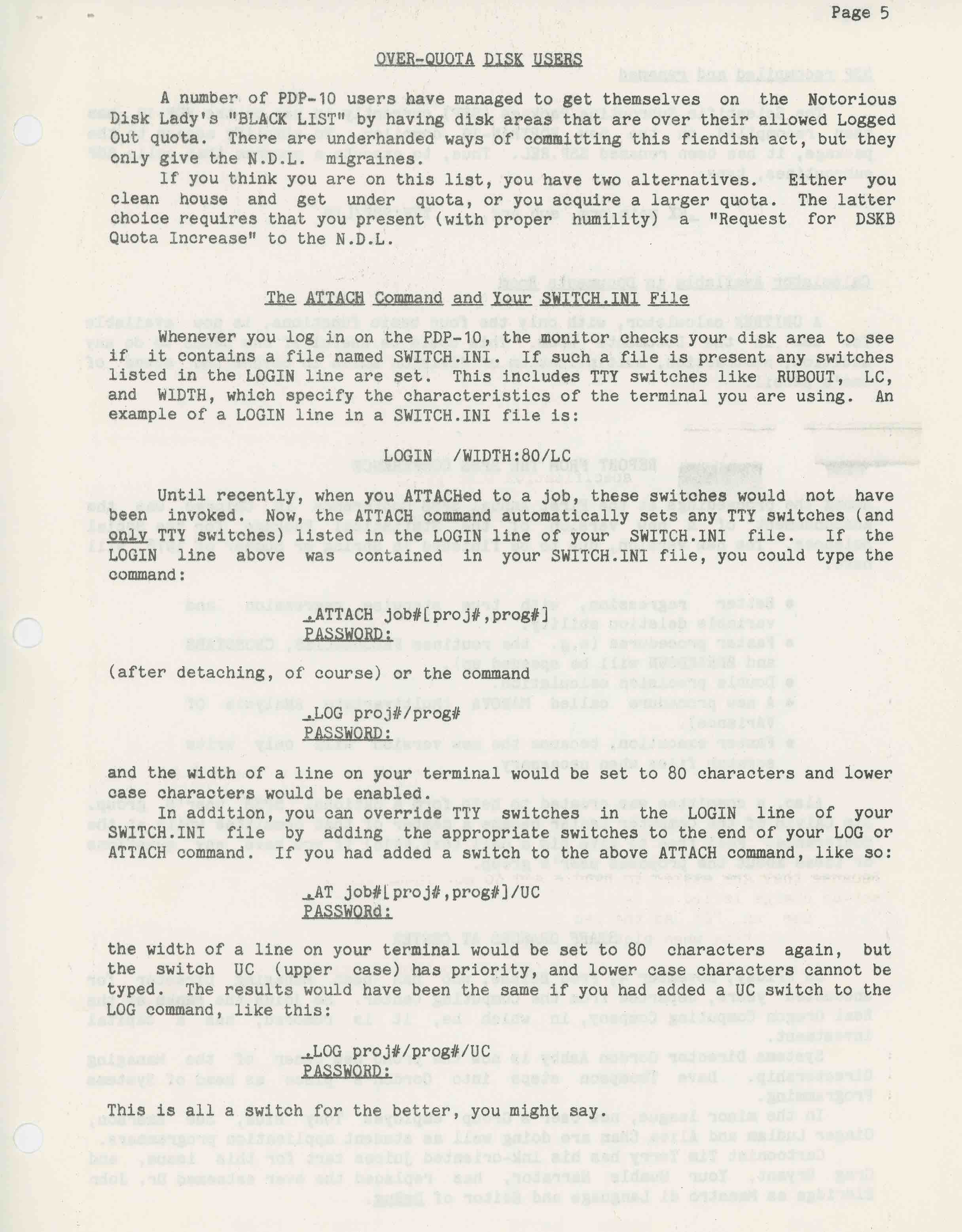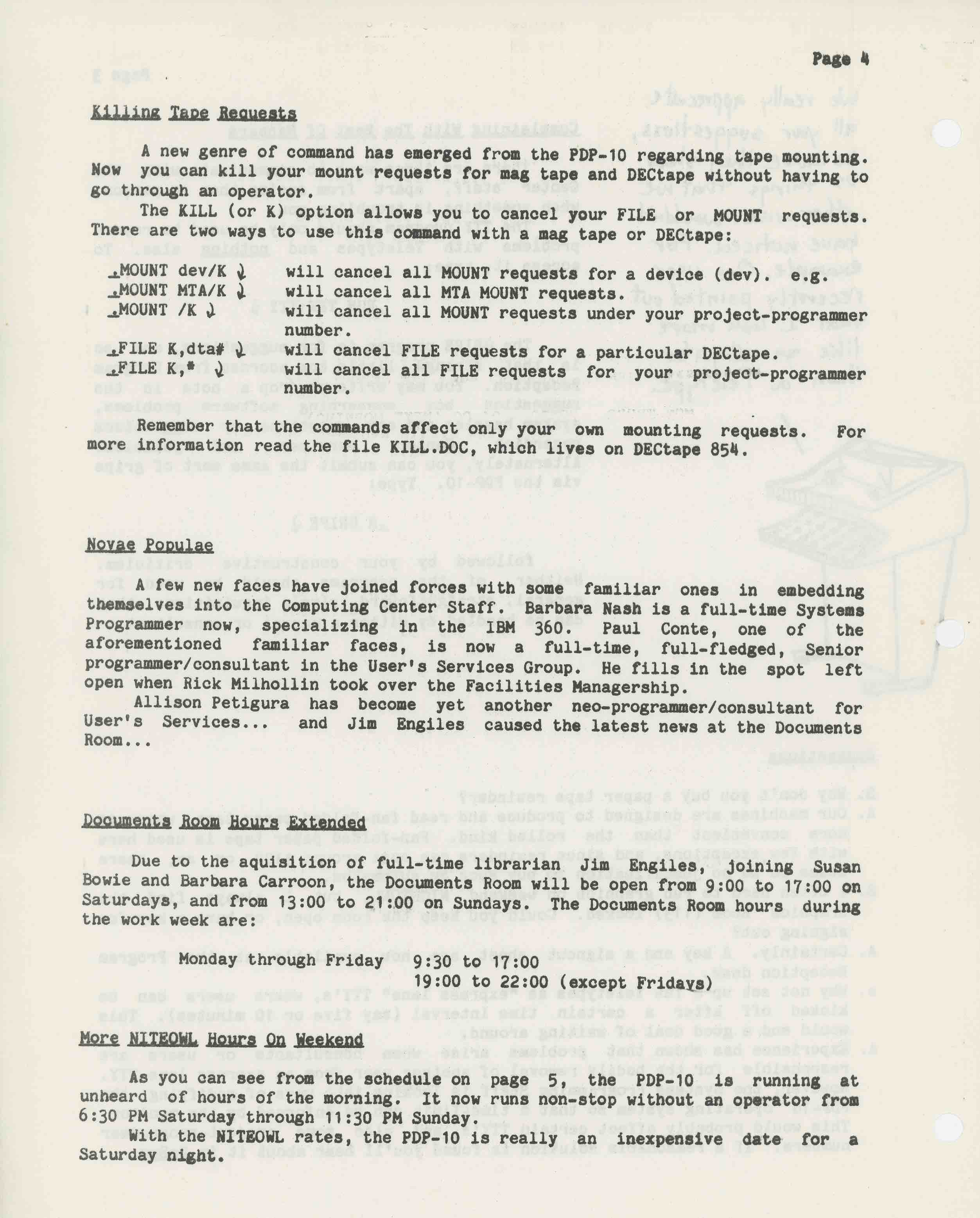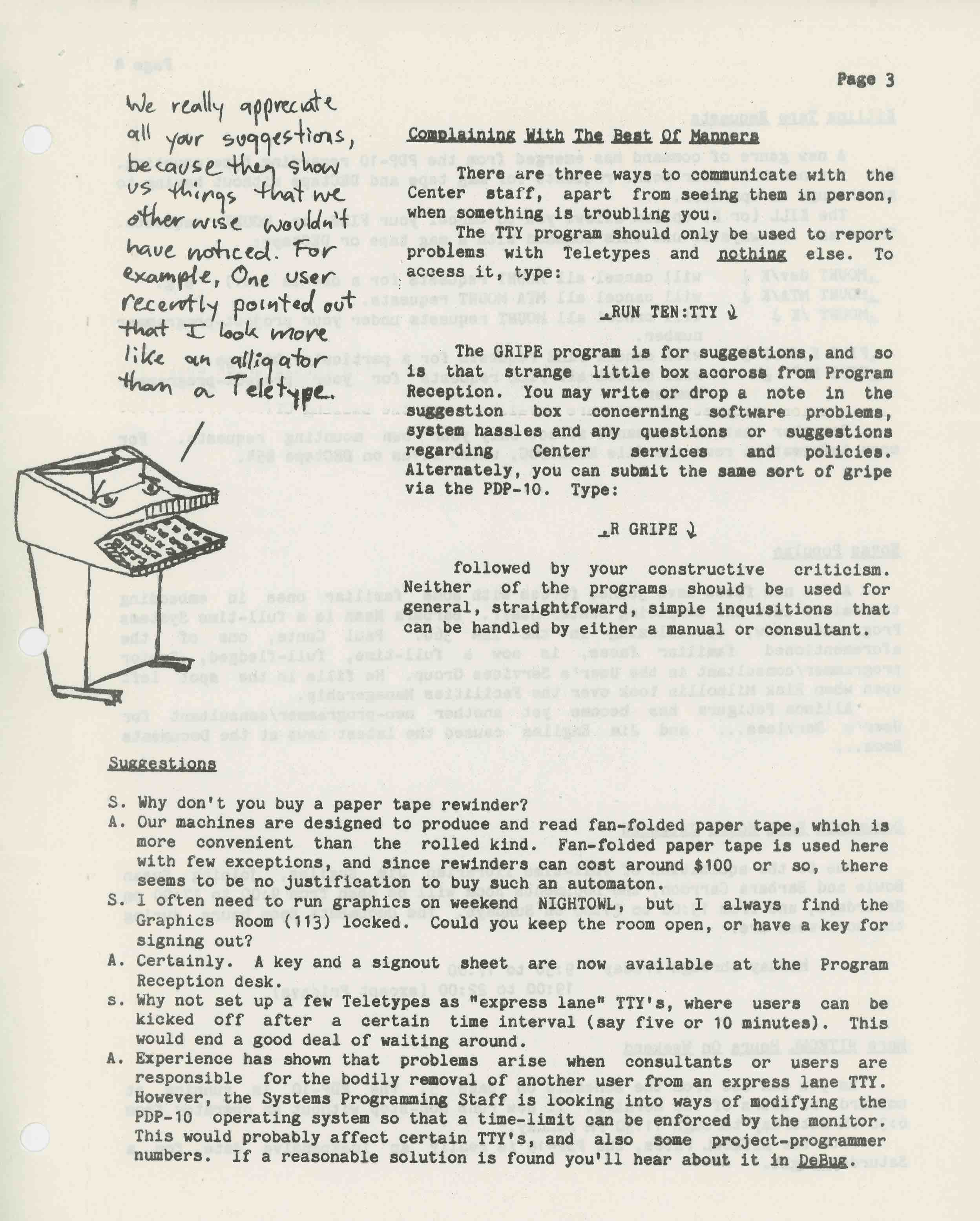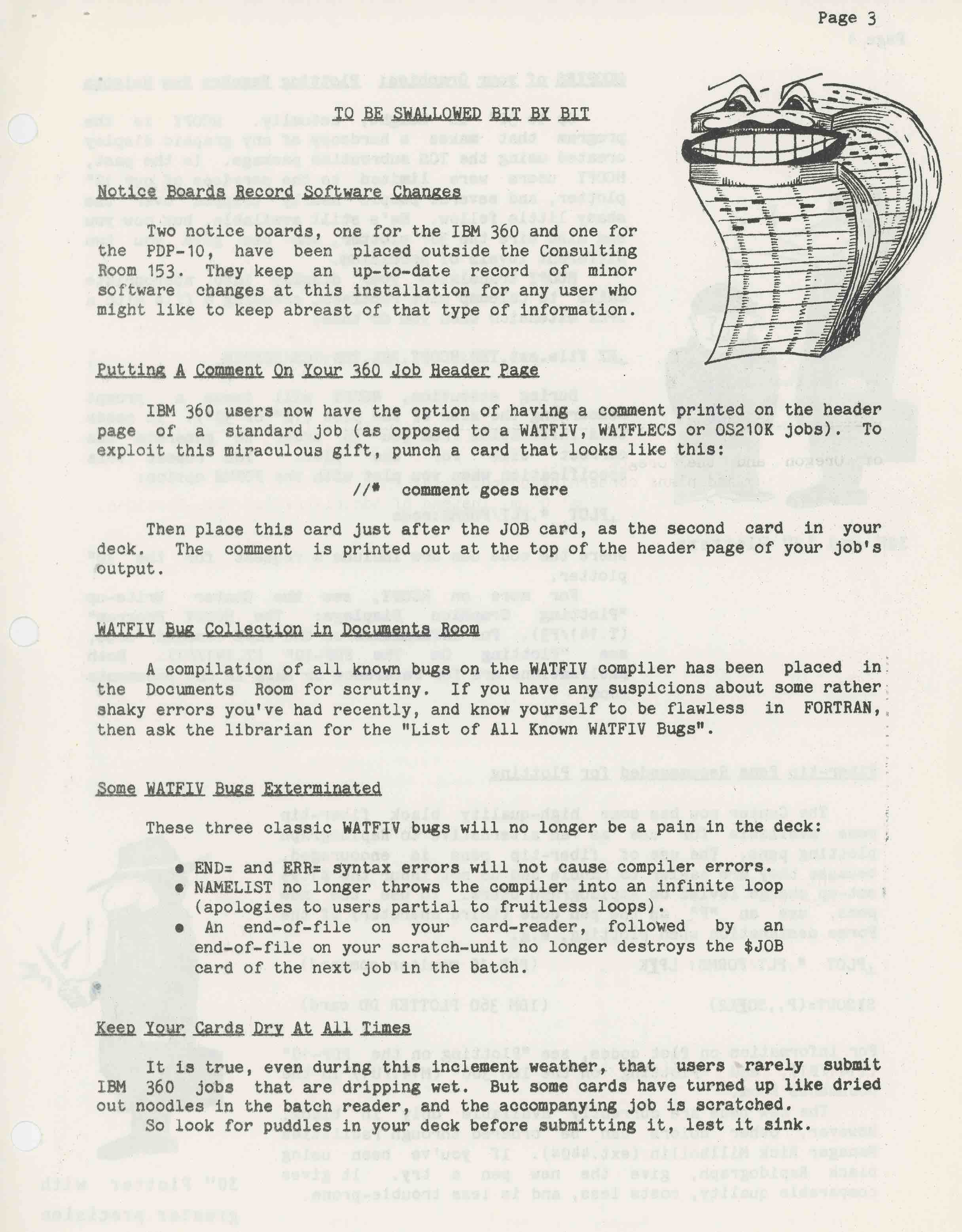 Just turned 17, now I had a salary and an office and no particular deadline. Unfortunately, I was encumbered with far too ambitious a university classload. I managed to produce one issue in 1977, and another soon after, and then I needed to exit. DeBug provided essential news to paying customers, and there weren't many channels for this, in an age of teletypes and punched cards. It needed attention I couldn't give it, and this focus on computing's necessary but trivial details drained energy from the exploration of more serious issues. But, for a moment, DeBug provided a nice outlet for painfully silly computer puns.
