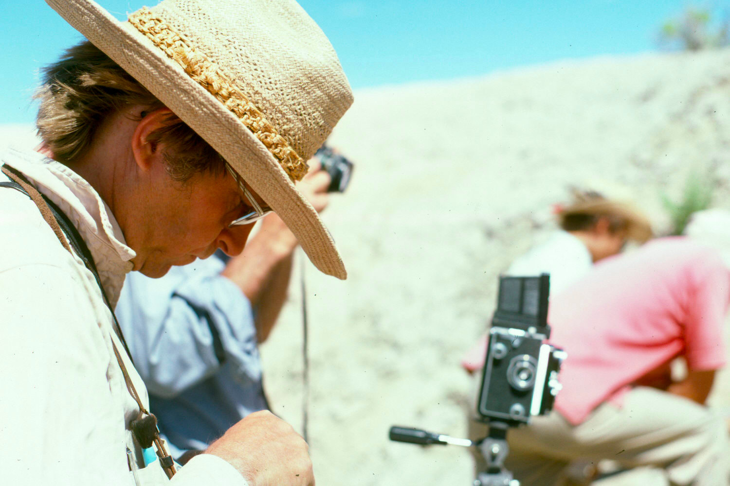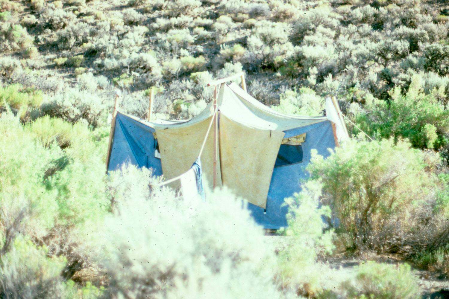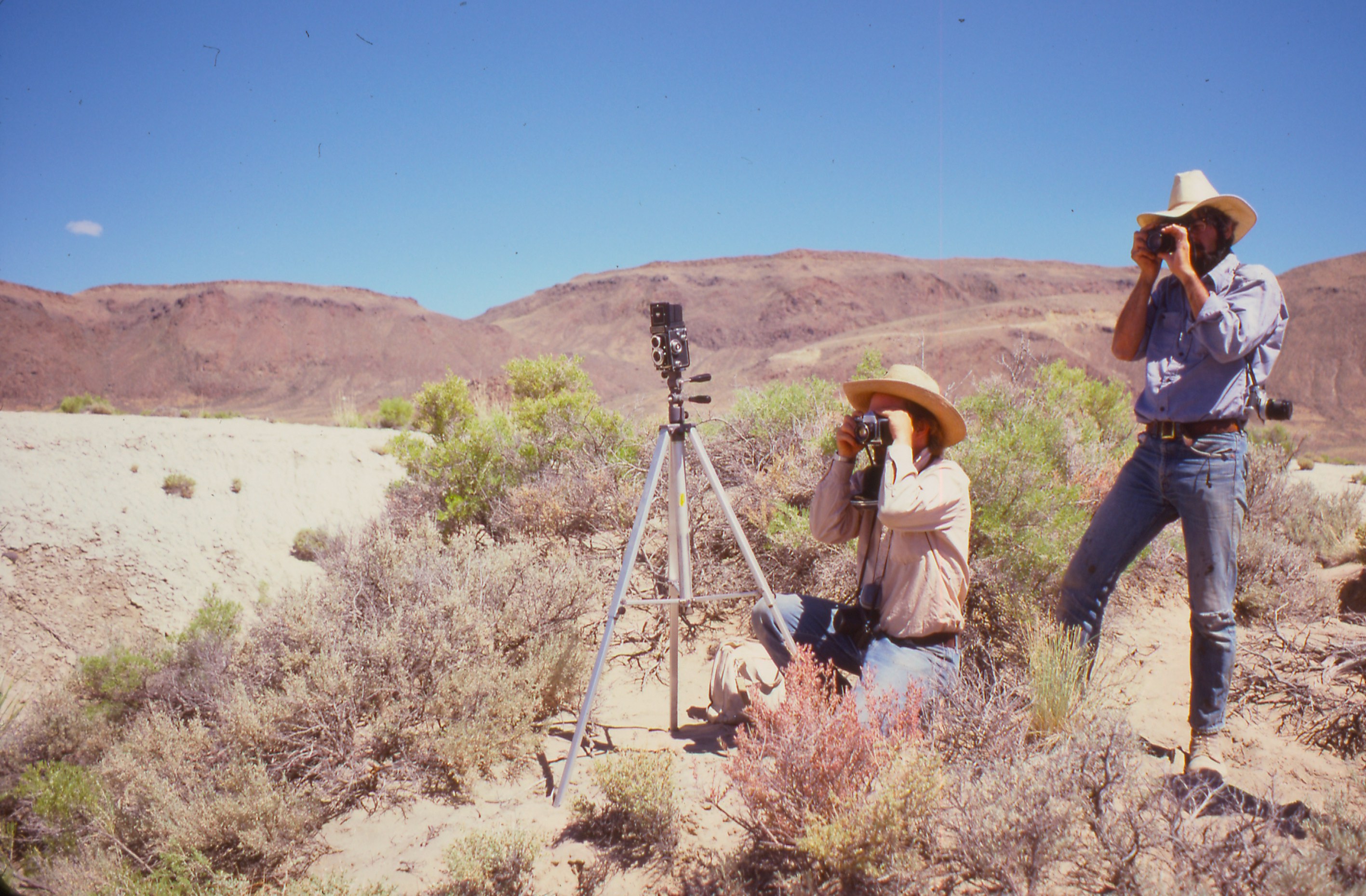 For some reason, I typically wore a thick, white canvas karate outfit, known as a do gi or gi, in the field. I think the top is in the photo below. Ah, I remember the reason: I believed it was perfect for the desert -- far from the skin, insulating, and reflective white, it kept me cool, yet the material was sufficiently thick to keep me warm after sunset. And I could 'workout' at the drop of a hat! Speaking of which, I also wore a floppy terry-cloth hat, which I'd ordered after seeing it in one of the Whole Earth Catalog publications. Good for soaking up sweat, it provided extra cooling if you dipped it in a mountain stream, like the one running by our main site. The gi became very dirty, very quickly, and being white, it was hard to wash well with no laundering facilities. If it wasn't for my chatty and introspective character, people would have thought I simply couldn't look after myself. They may have thought this anyway, in retrospect. I was probably considered just an eccentric know-it-all. But I did the work, and and there was social harmony, most of the time. The environment ensured this. We needed to be a tight-knit group.
