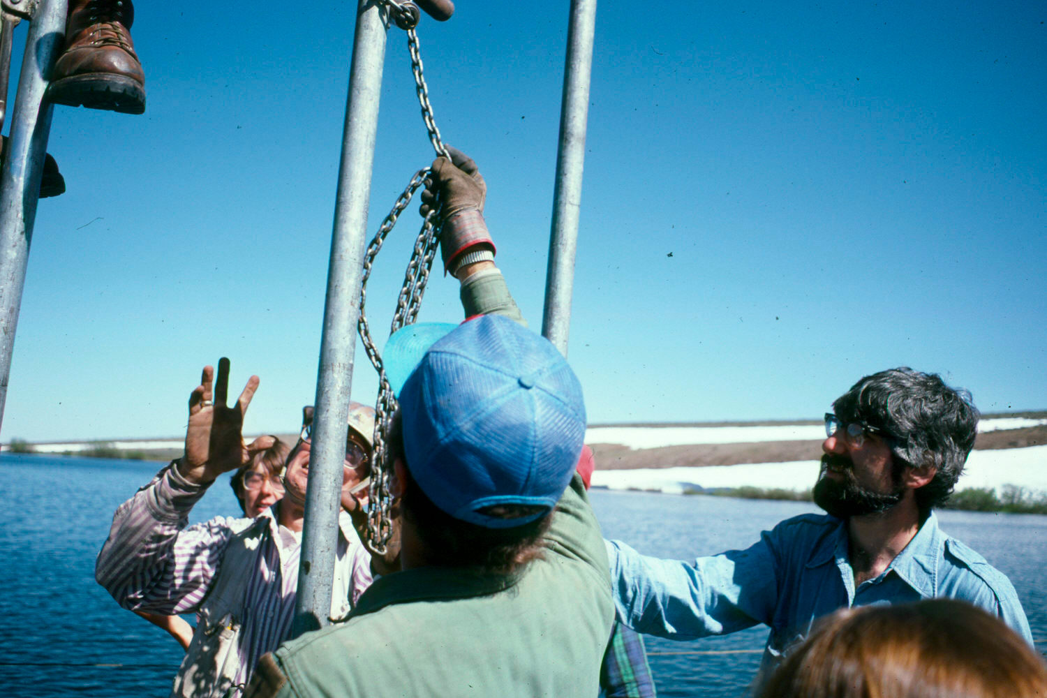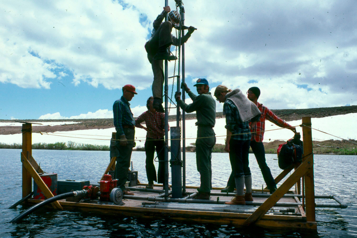You know, I was tempted to repeat something 'impressive' from my opening description, like "I took core samples of pleistocene sediment from the bottom of a mountain lake". But today, I see a photo like the one below, of a hard-working professor [pioneering palynologist Peter J. Mehringer, Jr., whose father won an Olympic Gold Medal in wrestling 47 years earlier ...] clambering over a drill-rig, day after day, suspended over ice cold water, and I think "how nice of him to make these archaeology students feel like they're being useful." Because we were not terribly functional on this raft -- falling off, dropping tools, asking pesky questions at critical moments ... very draining I'm sure. But now, I find it inspiring, that these accomplished middle-aged folks put up with us, and ran a field school for us. It takes such hard work and willpower to present what we know to the next generation.