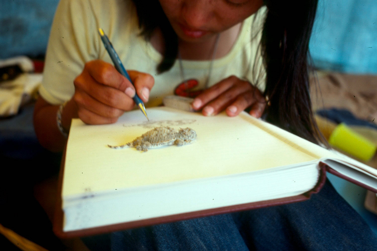 The Japanese student, another tent-mate, sketching one of the best live modeling performances I've ever witnessed -- it still astounds me that this wild lizard, unmanipulated, decided to remain as still as a rock for the duration of this figure study. [For the record, it's a phrynosoma platyrhinos, often called a 'horny toad', even though it's a reptile, and not an amphibian].