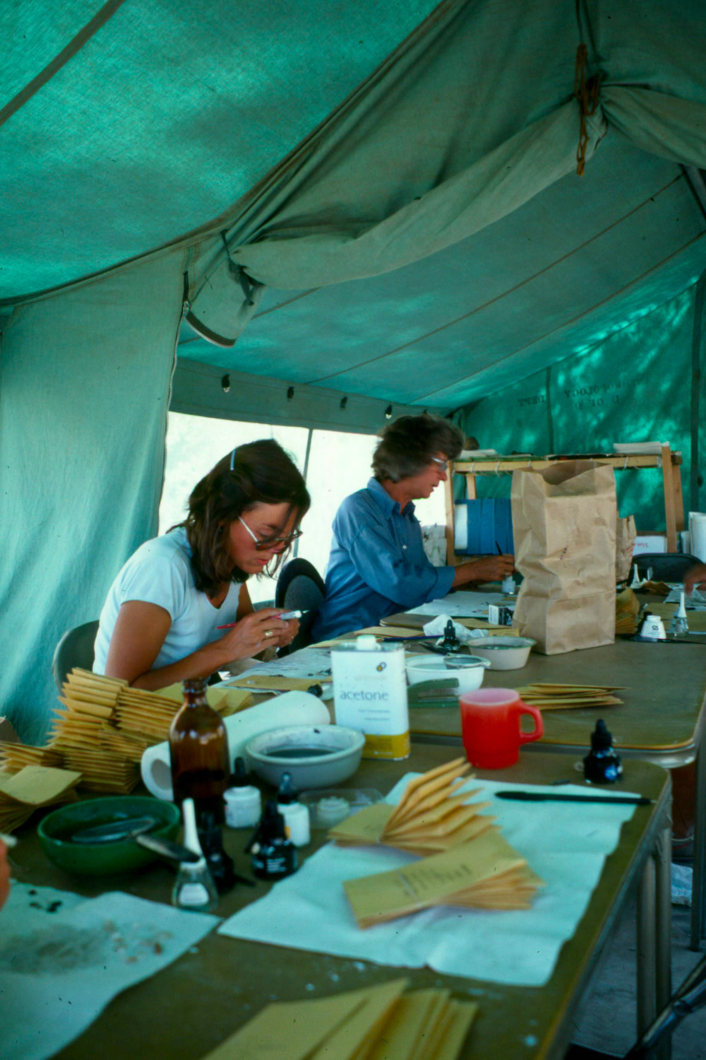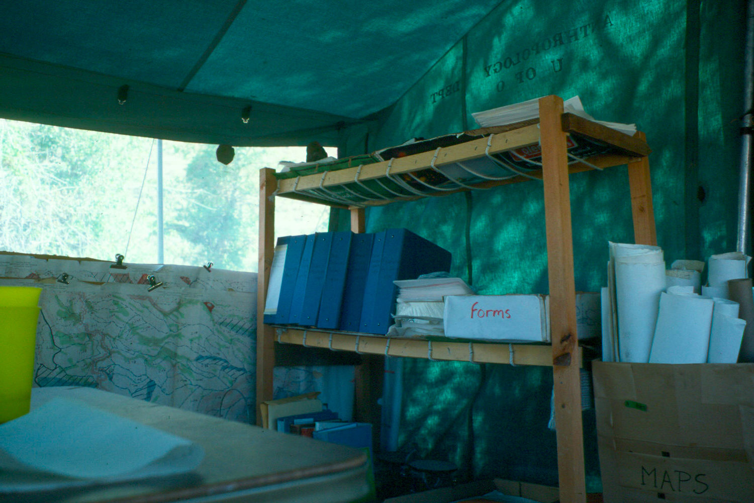 This is 'the lab'. If you were tired or sick -- from heat stroke for example -- you would work here for a week's rotation. It was tedious labelling and recording work, but also the coolest job. You could get comfortable at main camp, and catch up with your chores, and fix stuff around the camp that everyone complained about but had no time or energy to address. We listened to music tapes -- I remember the Notorious Byrd Brothers album, The Doors, Claude Bolling, David Grisman, the Holy Modal Rounders. We took luxurious lunch breaks, welcomed visiting scholars, and talked about everything. So very cozy.