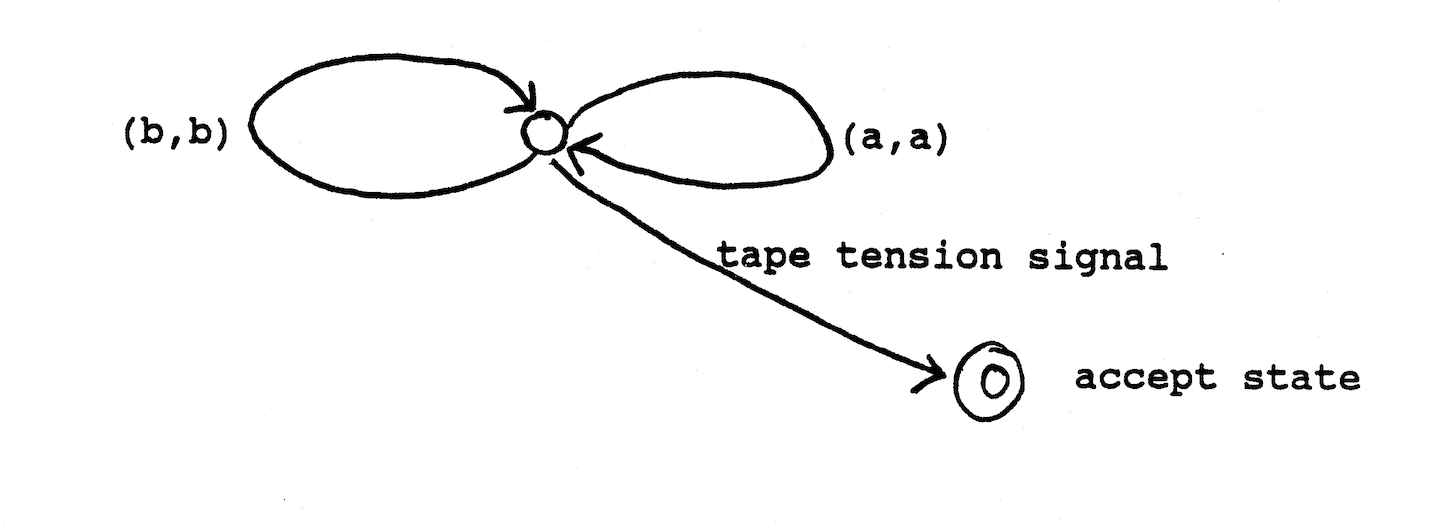 The finite state diagram for this machine is simple. Here we use a two-symbol alphabet consisting of 'a' and 'b'.