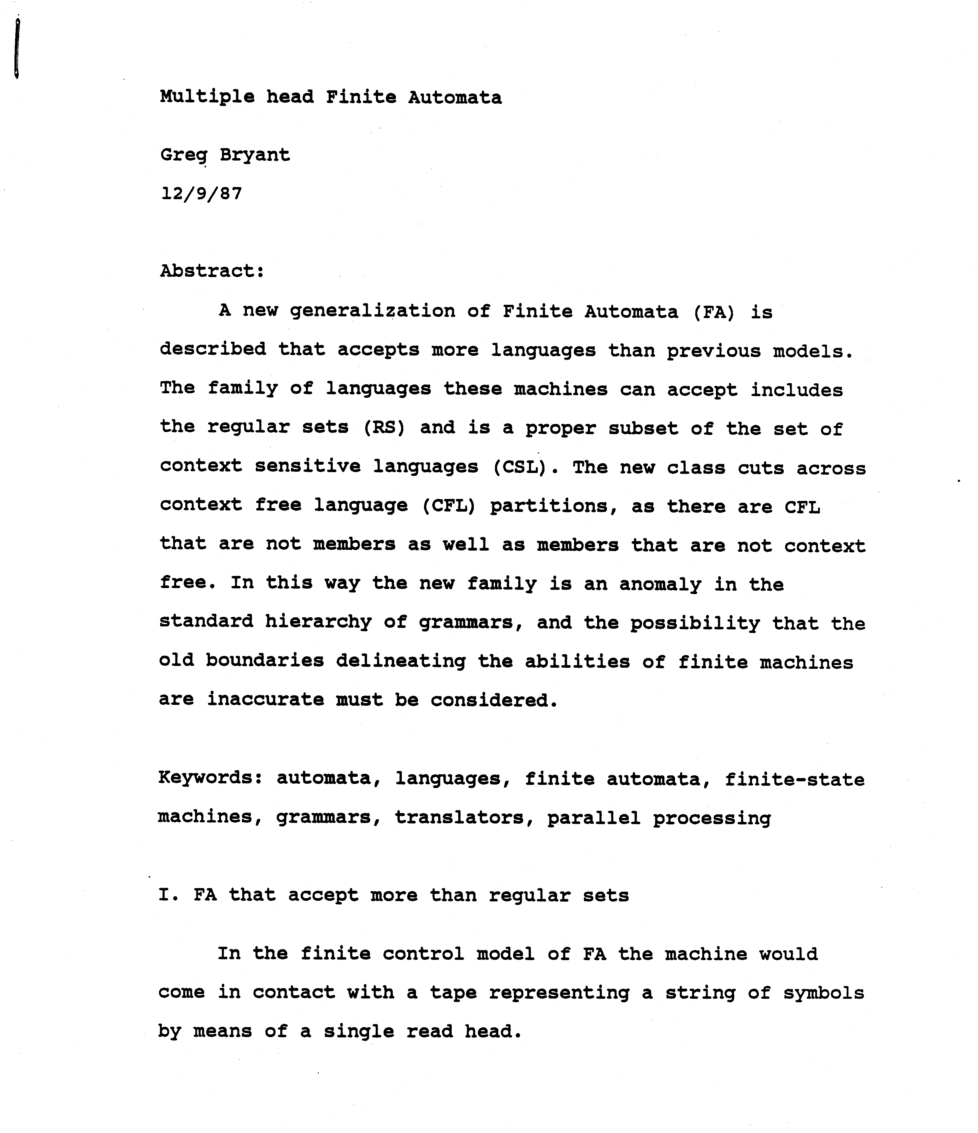 Keywords: automata, languages, finite automata, finite-state machines, grammars, translators, parallel processing