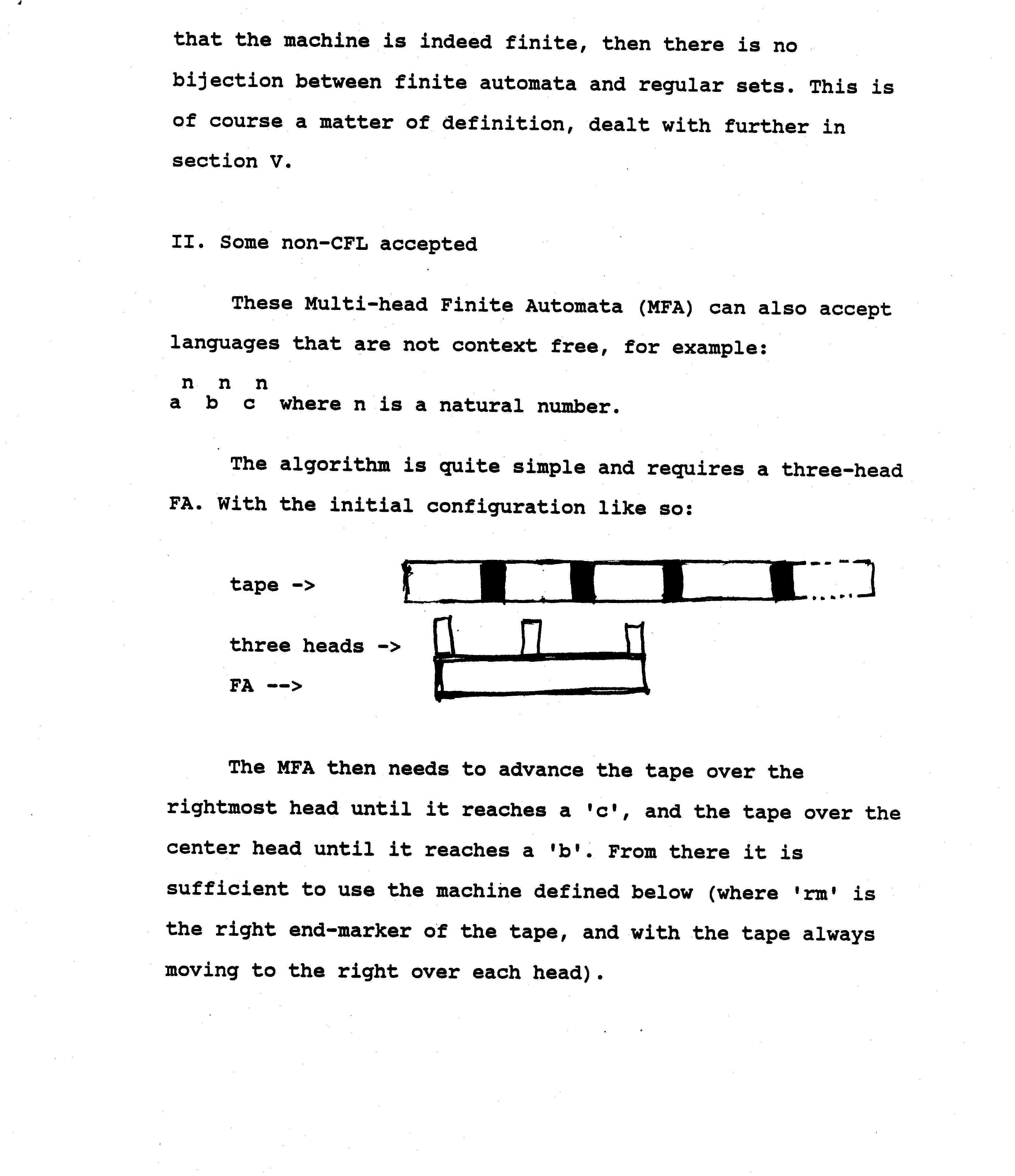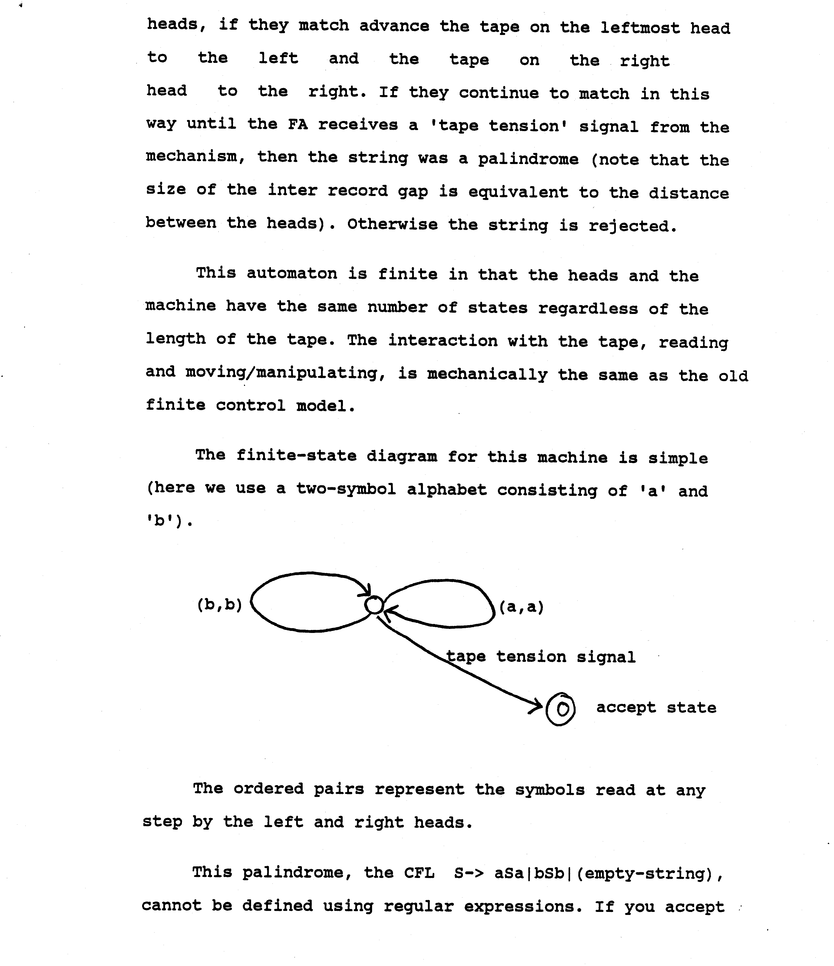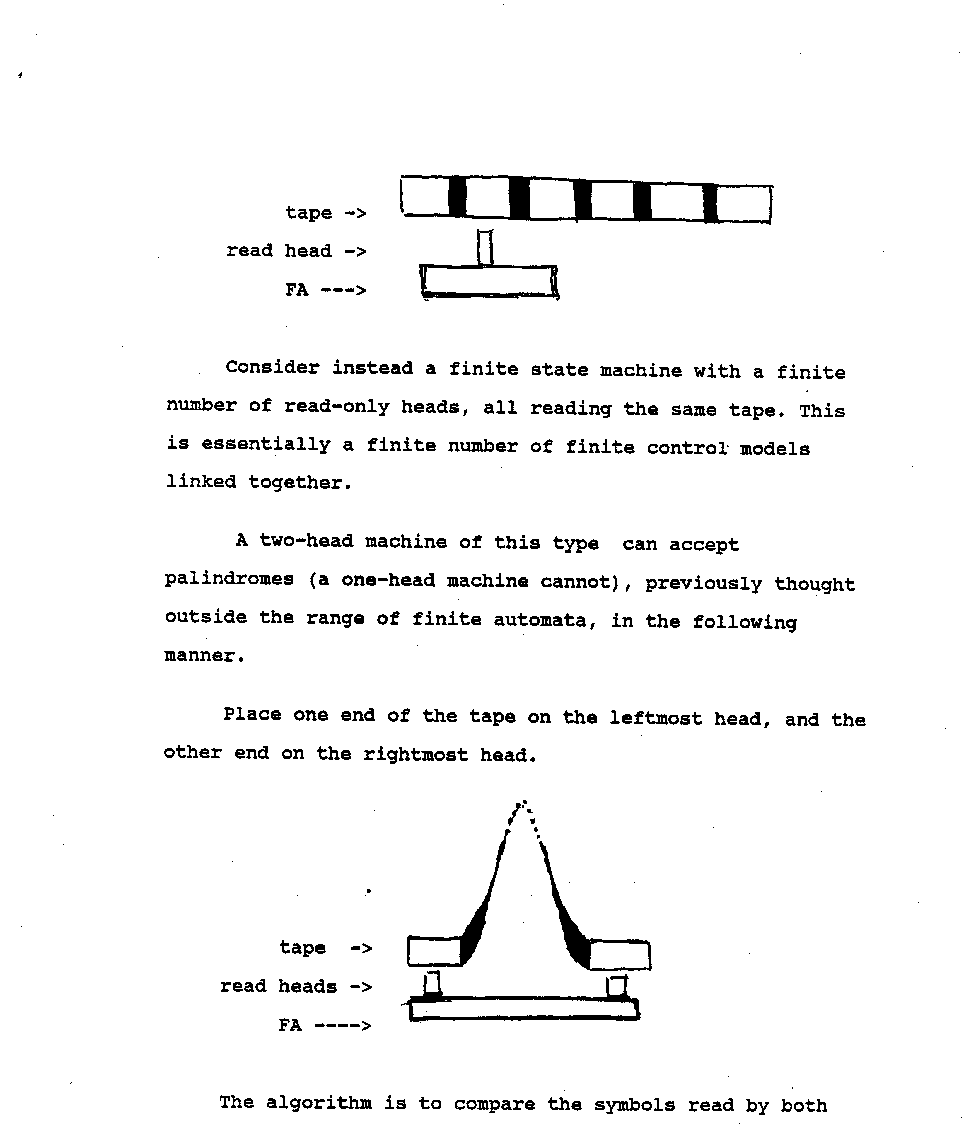 A two-head machine of this type can accept palindromes. A one-head FA cannot. Palindromes were previously thought to be outside the recognition ability of finite automata.