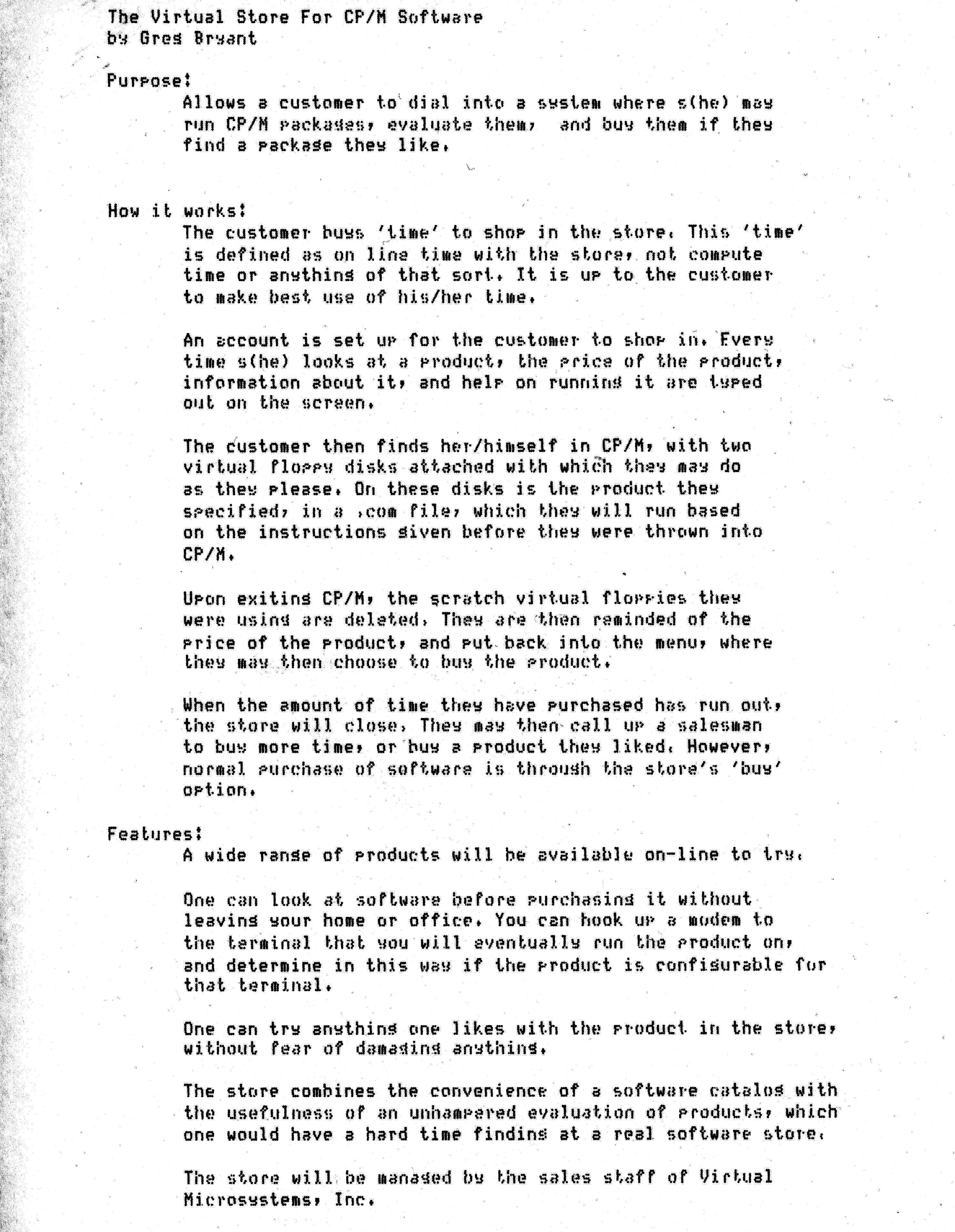 The First App Store 1982-1983 Greg Bryant Honestly, because of the nature of the computer business, with strange products demanded by people who are strangely in positions of power, surrounded by secrecy, sometimes released in secrecy -- nobody can know if this was the first app store. I thought it was a pretty natural thing to do, working at a startup that simulated personal computers on mainframe timesharing systems. I think I wrote this proposal in 1982, and built it in 1983, combining our phone-terminal board and software with our virtual CP/M machine boards and software, running on our in-office Vax 11/780. Significantly, 'The Virtual Store' wasn't just for buying software online. It also allowed an online demo -- with a disposable virtual machine! And we charged people for the privilege of using it. That said, I was very disappointed at this startup's management, by the time we released it. The store was shut down because I left, and because the sales team didn't quite know how to grow the customer base. Too far before its time, perhaps. I did some consulting for awhile, and then went to work at Intel headquarters as a Unix guru / evangelist. In 1997, during the dotcom boom, I revisited this demo idea at my Palo Alto startup, Workspot.